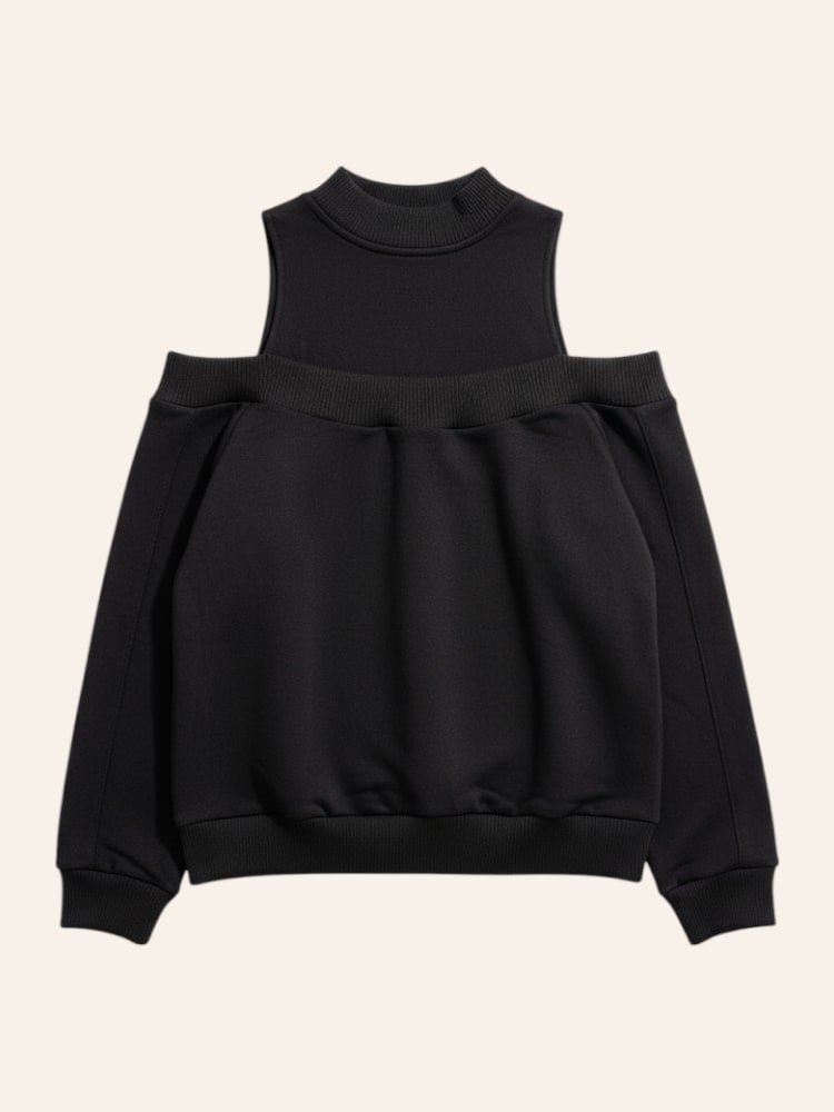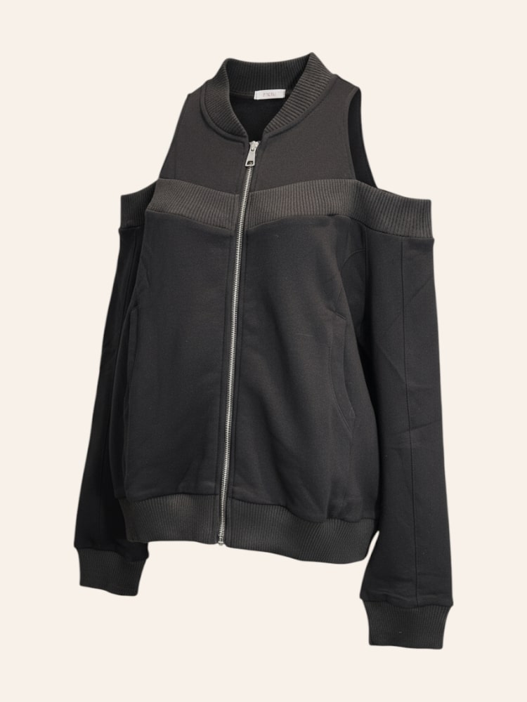 A jaqueta preta com recorte nos ombros traz um visual descolado e urbano, perfeita para quem ama conforto sem abrir mão do estilo. O tecido em moletom leve com elastano oferece maciez e liberdade de movimento, ideal para usar no dia a dia ou em produções mais ousadas à noite.