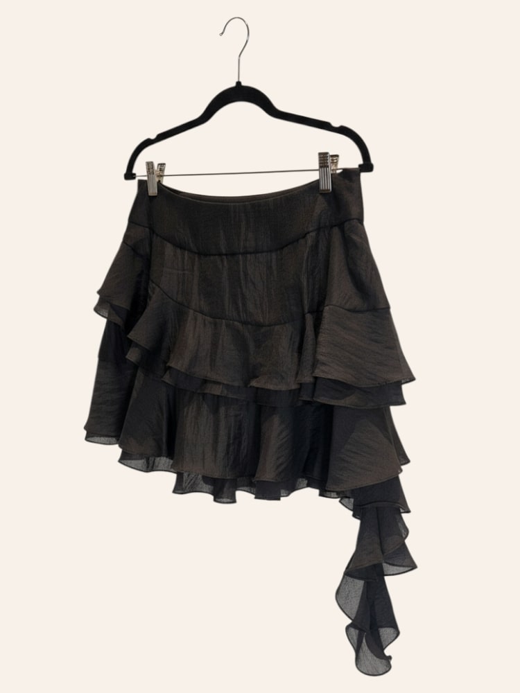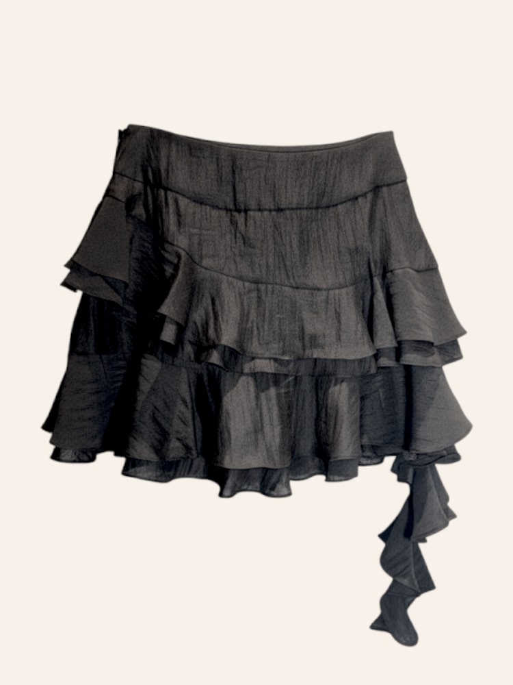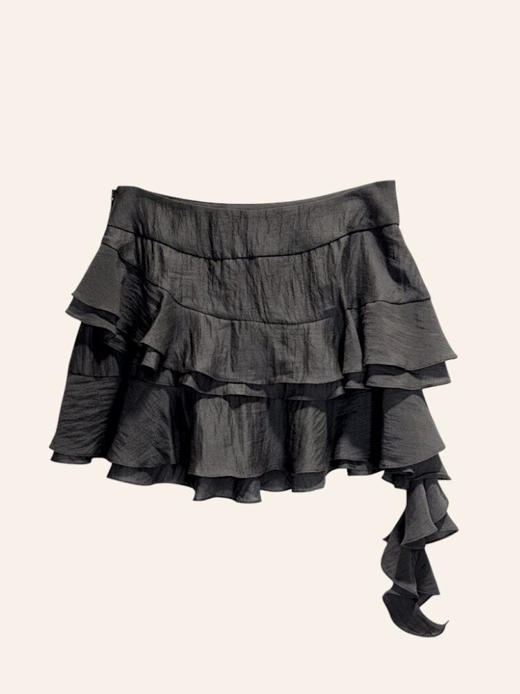 A Saia Melane é uma peça fluida e feminina, com camadas de babados que criam movimento e leveza a cada passo. Seu tecido levemente acetinado e textura suave trazem um toque romântico e sofisticado, enquanto o corte assimétrico na barra adiciona um charme despretensioso e moderno.